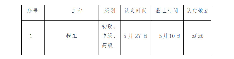 二、認(rèn)定職業(yè)(工種)、級別、認(rèn)定開始時間、報名截止時間、認(rèn)定地點詳見下表: